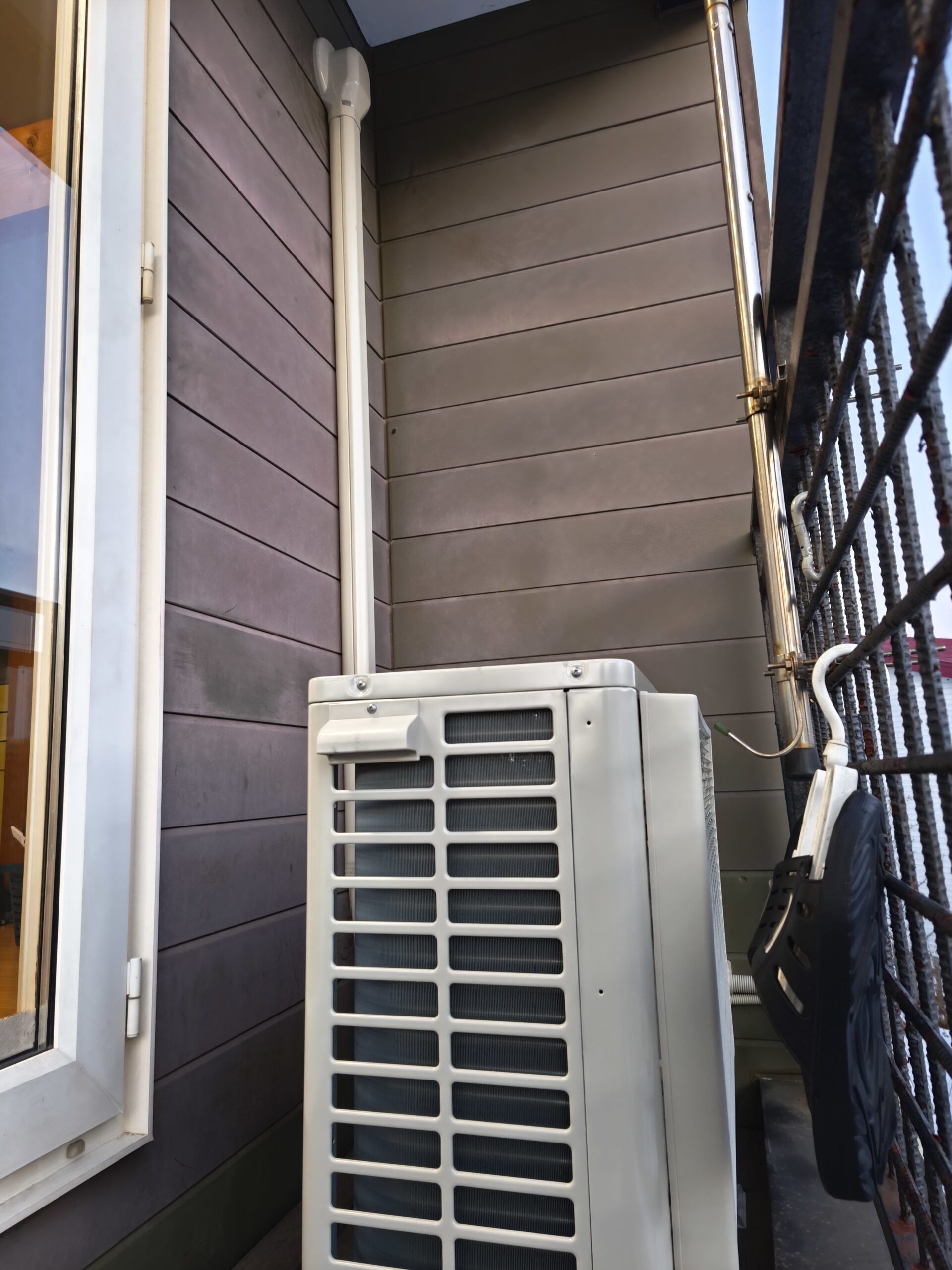 室外機は二階ベランダ置き、オプションで屋外配管カバーを取付いたしました。