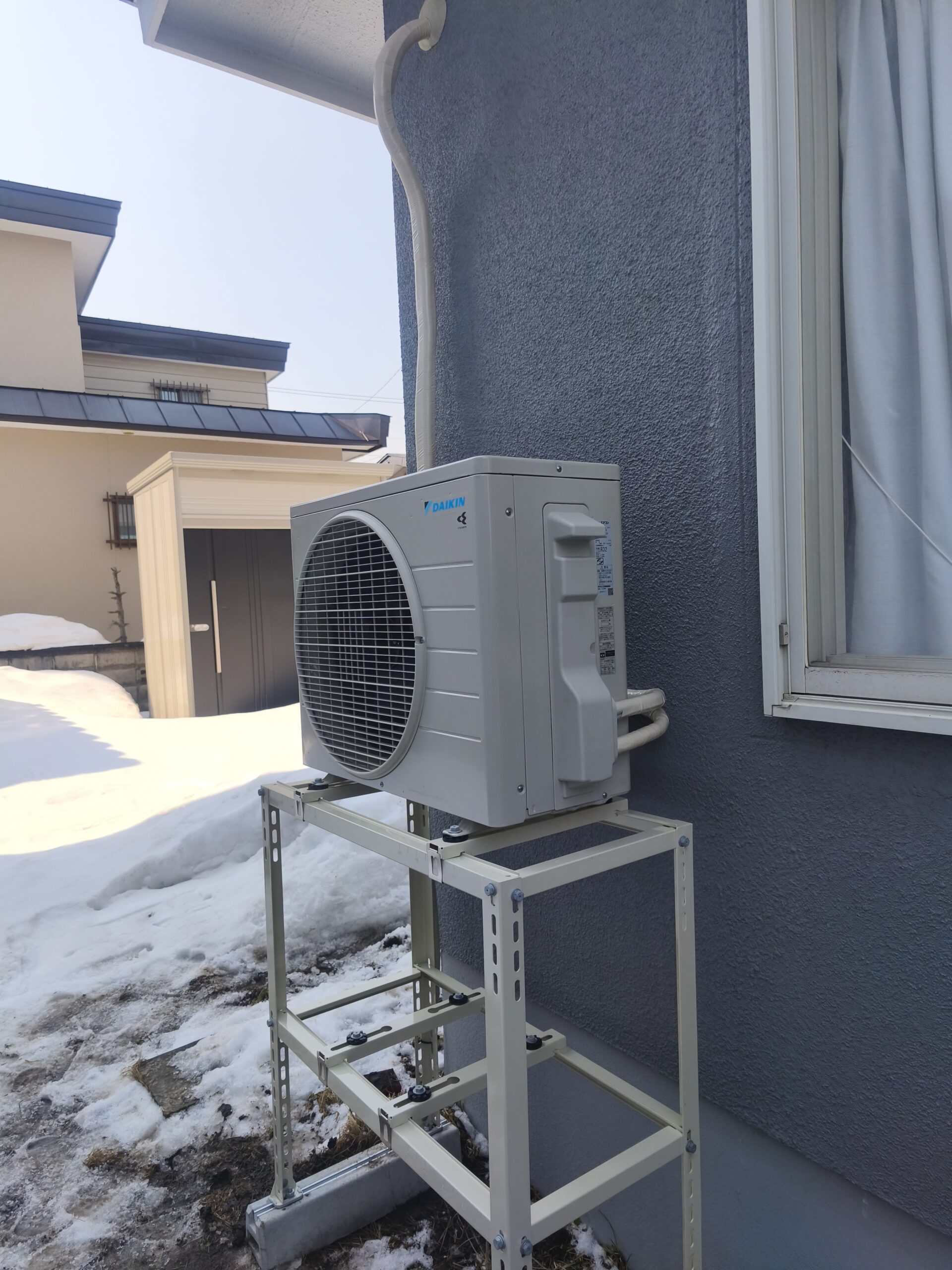 冬の間エアコンを使用しなくても、地面に置いたまま放っておくと雪の圧力で故障のリスクがありますので、こういった架台を設置すればそのリスクを軽減できるのでお勧めです。