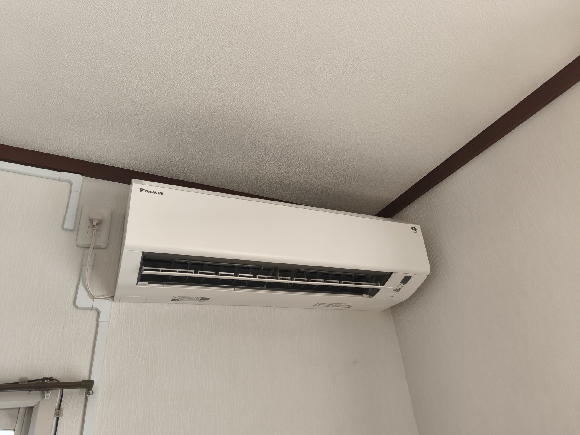 エアコン用のコンセントもありませんでしたので、併せて増設工事させていただきました。配線モールを使用した露出配線です。