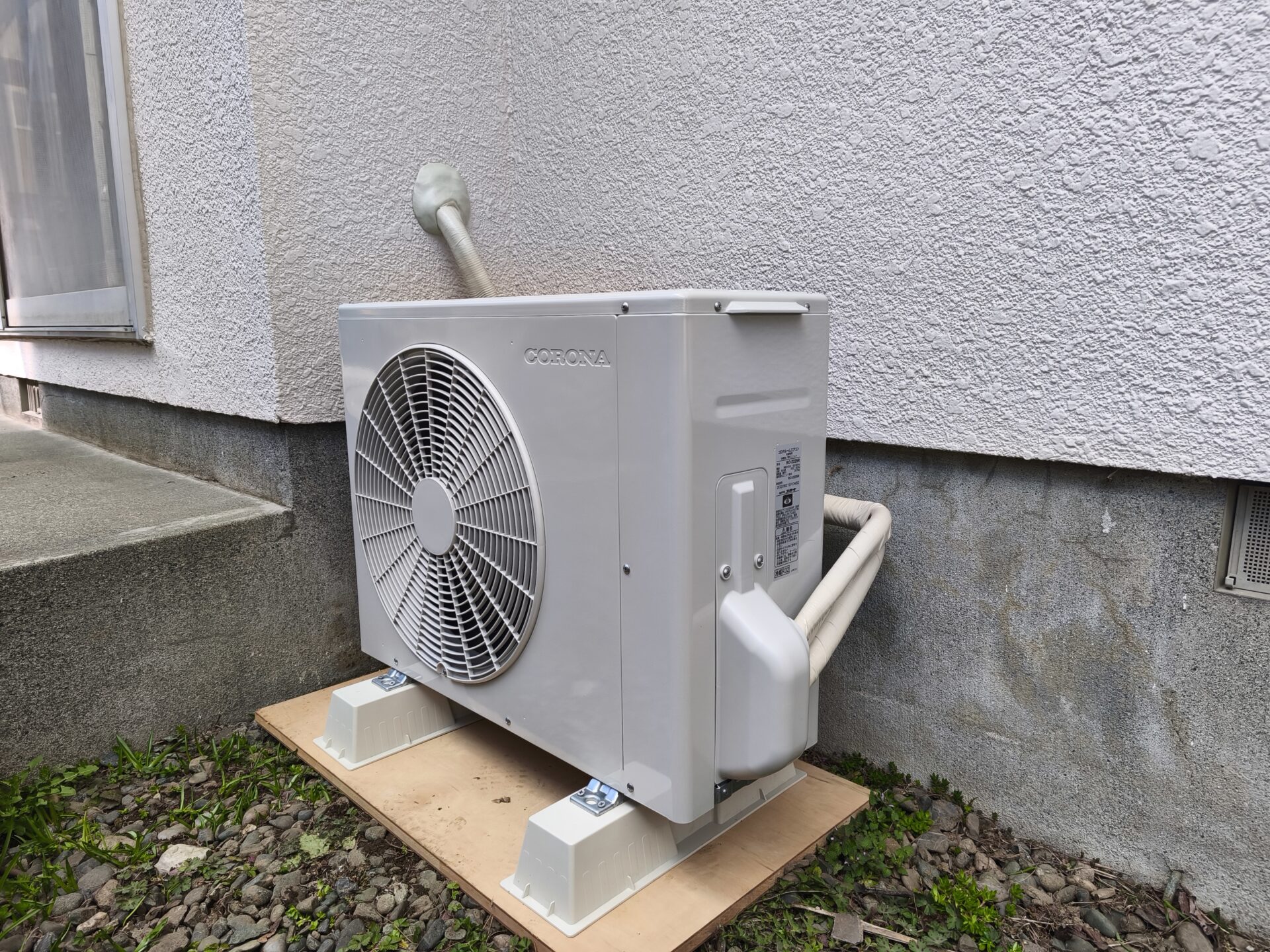 また、コンセント工事もお客様自身でなさるとのことで今回は工事無しです。写真は試運転の為に近くのコンセントから仮に運転している状況です。