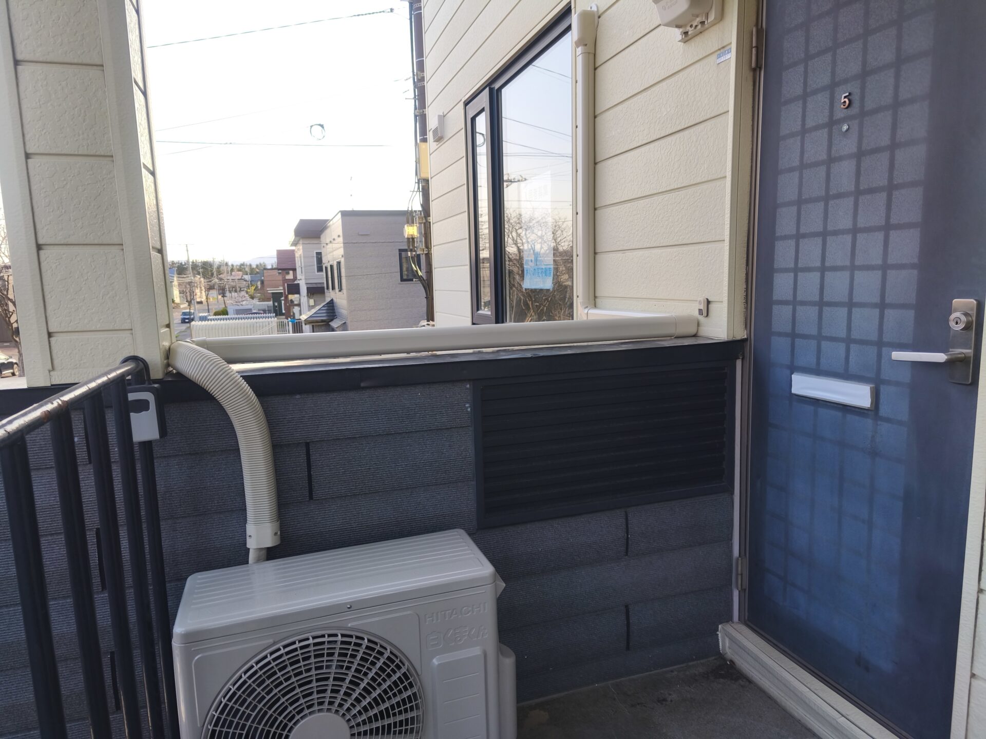 室外機を地面に設置したくない、壁掛けは振動が気になるとのことで、お客様と協議の結果階段の踊り場に設置いたしました。